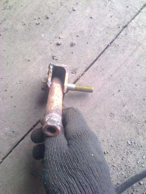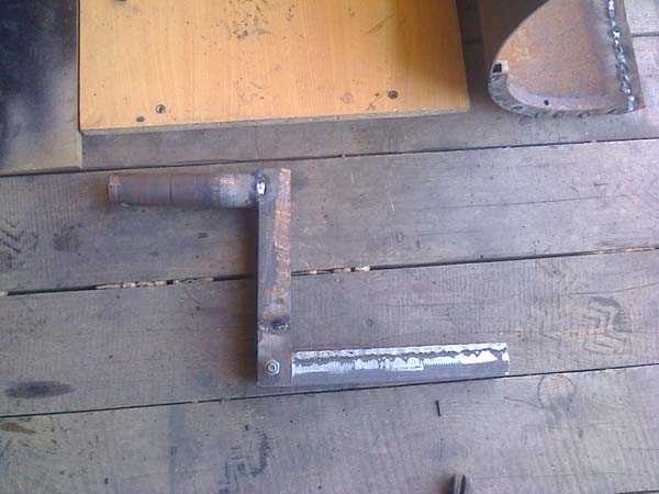 - Из трубы квадратного сечения изготавливается держатель в форме буквы «Г». Короткая сторона держателя закрепляется на поворотном секторе, второй конец жестко фиксируется на кронштейне мотоблока. Для регулировки высоты ножа используются болты, вкрученные в переходник.