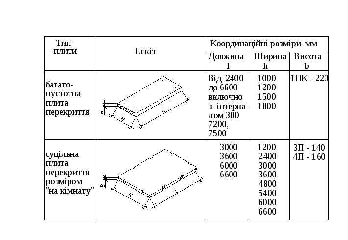 - Размеры железобетонных перекрытий (мм): длина 2 400 – 12 000; ширина 1 000 – 3 600. Для 1 ПКК – 3 ПКК – от 4 800 до 7 200.