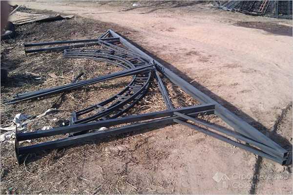 - Заготовьте специальную трубу, которая станет опорой. Ее потребуется выгнуть до нужного вам радиуса. Балку прикрепляют к вертикальной стойки посредством сварки или болтов. Для обеспечения дополнительной прочности можно воспользоваться металлической косынкой.
