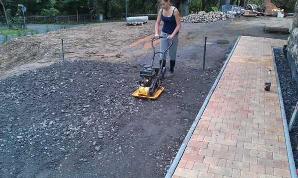 Лучший способ утрамбовать песок и гравий — использовать виброплиту. Если ее нет, можно сделать самодельную трамбовку. Берете бревно, приделываете ручки, снизу крепите прочную площадку (толстую доску). Поднимая и резко бросая это орудие, уплотняете песок/щебень