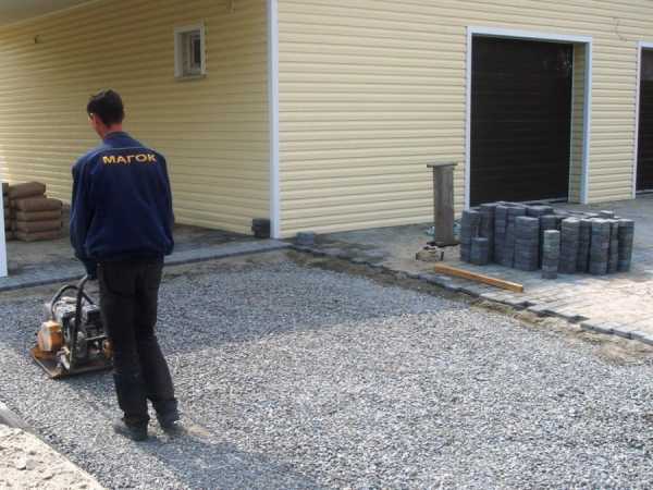 - На песок укладывается слой крупного гравия (20-40 мм), выравнивается, трамбуется. Его толщина — 10 см в готовом виде.