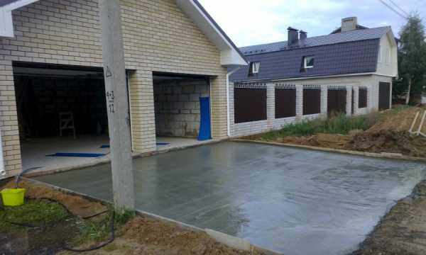 Наиболее долговечный вариант автомобильной стоянки для загородного участка — это парковка из бетона. Забетонировать площадку под машину можно как основание для будущего мощения, но часто бетонное покрытие железнится и остается в качестве финишного. Под бетонную плиту традиционно устраивается основание из песка и щебня, а армирование происходит при помощи вязки каркаса из арматуры диаметром 10 мм. Залить площадку под машину необходимо товарным бетоном марки М300 с толщиной слоя 10–15 см.