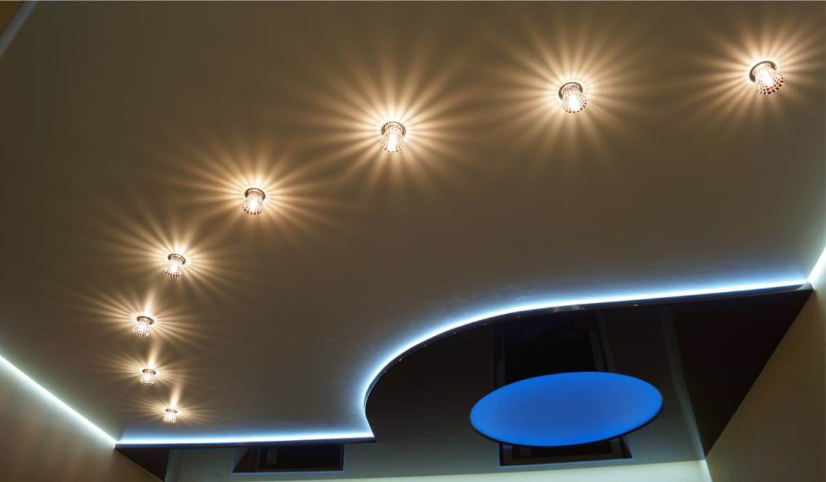 Данный тип освещения наиболее часто используется, как в в одноуровневых, так и в сложных многоуровневых композициях, совмещенных с натяжными и подвесными конструкциями. Точечный фонарь прост в обслуживании и ремонте. С его помощью удается распределить световой поток в те части помещения, где освещение наиболее важно.