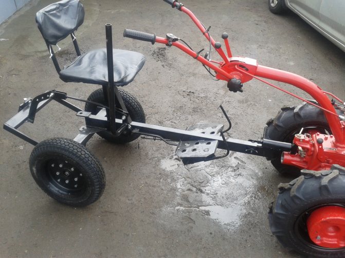 Кратко рассмотрим конструкцию минитрактора из мотоблока, сделанную руками мастера.