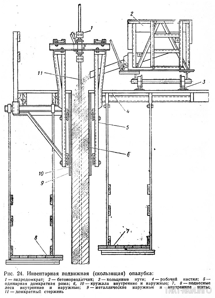 Домкраты устанавливаются на рамную часть конструкции. С их помощью производится подъем опалубки. В качестве направляющих выступают стержни.