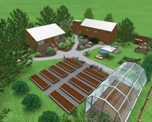 Остальную территорию можно засадить картофелем, грядками или сделать из нее сад с плодовыми деревьями, ягодными кустарниками. Чтобы не бегать через весь сад за зеленью или редисом, грядки для них лучше обустроить ближе к дому или по соседству с летней кухней. Громоздкие теплицы обустраивают в конце сада. Декоративные насаждения располагают ближе к входу.