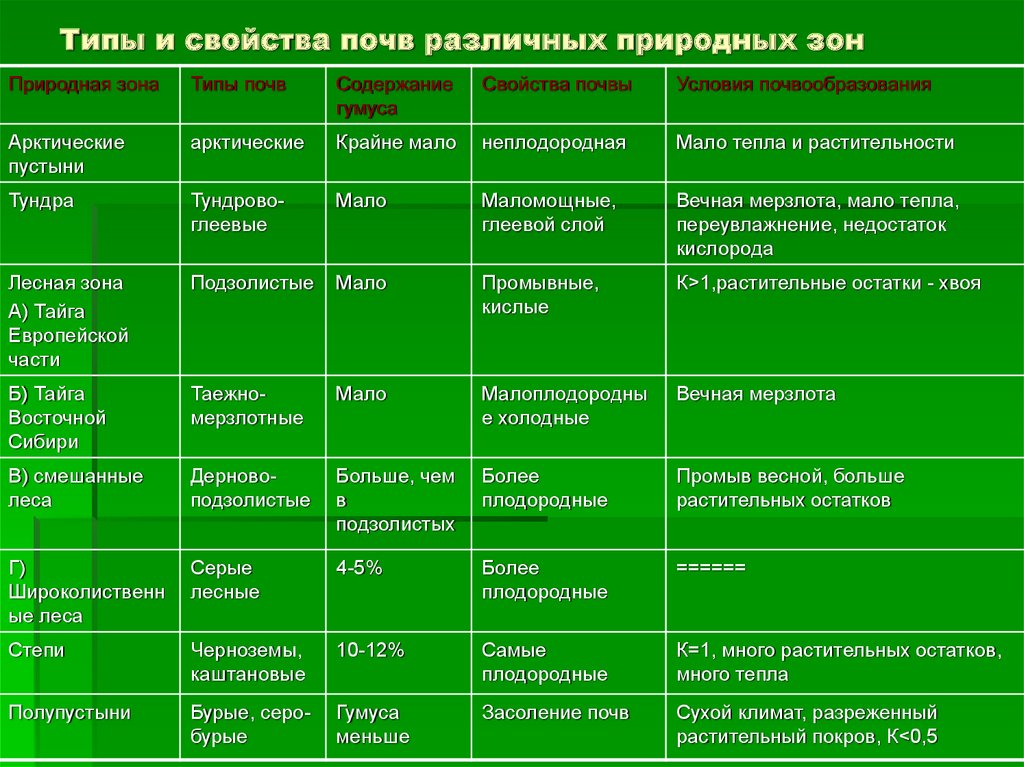 Почвенные организмы — для каждой почвы свои. Например, в лесных почвах очень много микроскопических грибов, а в степных черноземах их мало и преобладают бактерии, поэтому попадающие на поверхность растительные остатки в лесу и степи разлагаются по-разному, из-за чего и формируются разные почвенные горизонты.