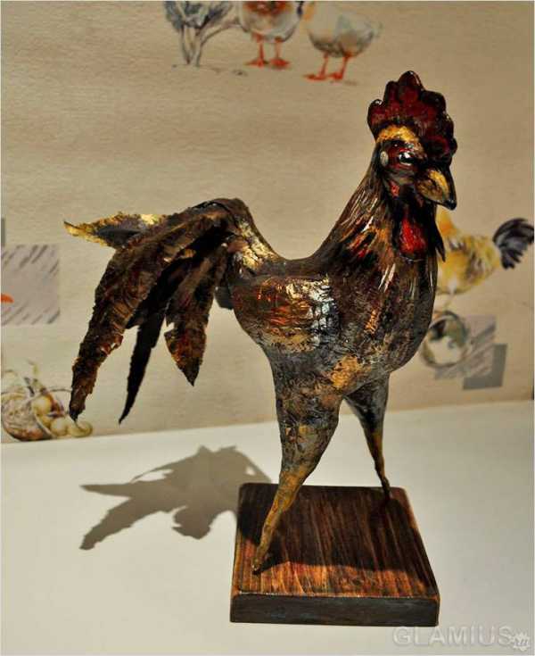 Воспользовавшись базовыми основами этой схемы, можно сделать и большую настольную фигурку петушка. Для этого его нужно будет закрепить на подставке, которая также может быть получена путем многослойного склеивания картона.