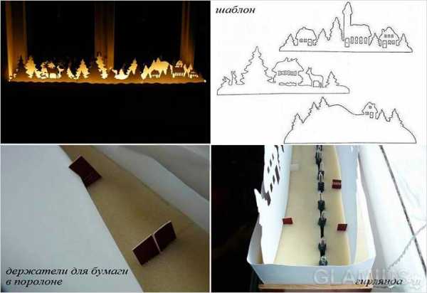 Из обычного ватмана можно сделать декор окна, вырезав силуэты заснеженных елок, зайчиков, домиков и сделав подсветку. Смотреться будет просто волшебно.