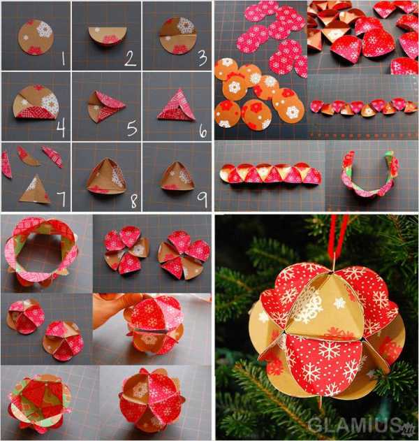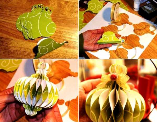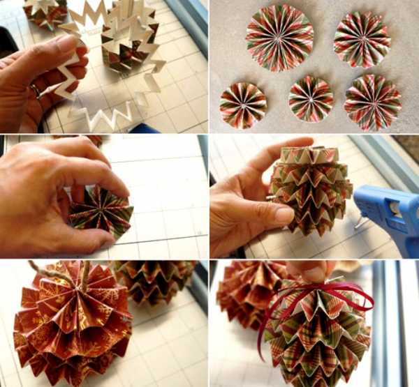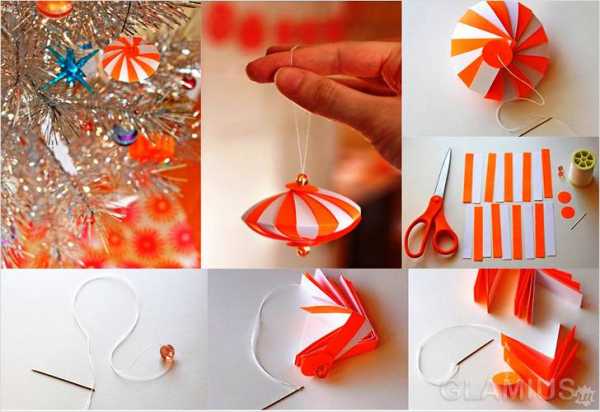 Весьма оригинально будут смотреться объемные украшения, они могут стать основным «гвоздем» декора вашей елки. Самое главное, точно таких вещей не будет ни у кого в мире! Это различные шары и фигурки, которые технически сделать очень просто. В одном случае, например, необходимо вырезать много круглых заготовок из бумаги одинакового размера, прошить их все вместе посередине, и склеить листочки между собой так, чтобы получилось, как на фото.