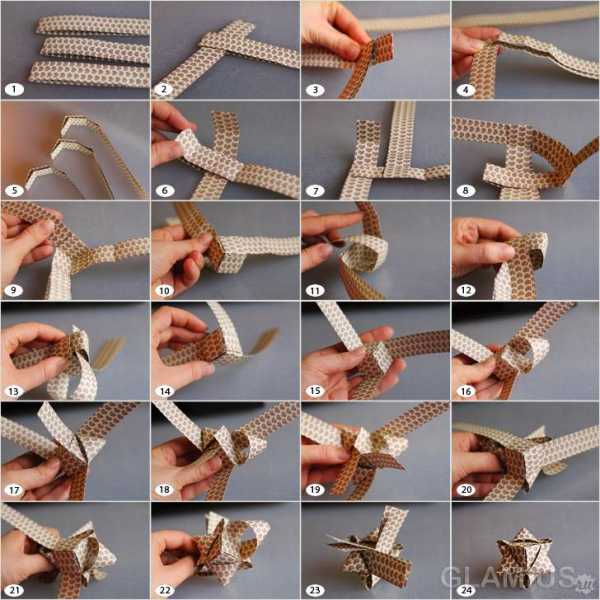 В другом случае нарезают полоски бумаги, можно разной толщины, цвета, фактуры, склеивают один конец с другим и соединяют их все вместе, чтобы вышел шар. Такой: