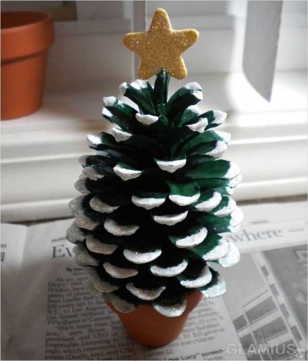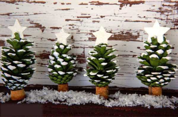 Шишки настолько похожи на небольшие елочки, что вам не составит труда сделать к празднику целый бор зеленых красавиц. Украсив их бусинами, стразами и искусственным снегом, можно буквально в несколько минут наполнить дом новогодним настроением. Для изготовления такой поделки вам понадобятся: