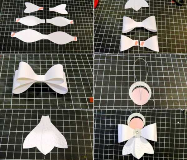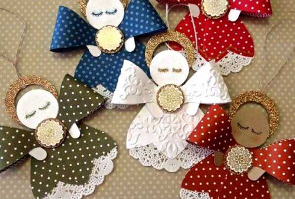 Из дизайнерской бумаги вырежьте детали трех видов. Первые две станут нарядом ангела, остальные – крыльями. На концы каждой приклейте скотч. Соберите вырезки, как показано на фото. Детали крылышек соедините, чтобы вышел крупный бант. Из однотонной бумаги вырежьте головку ангела (круг диаметром 1,5 см), из блестящей – нимб (диаметр – около 2 см). Склейте их вместе. Можете дорисовать ангелу глаза и румяные щеки. К тыльной стороне головы прикрепите петлю из нитки. Соберите детали воедино. Место, где соединяются крылья и тело, оформите декоративной пуговицей.