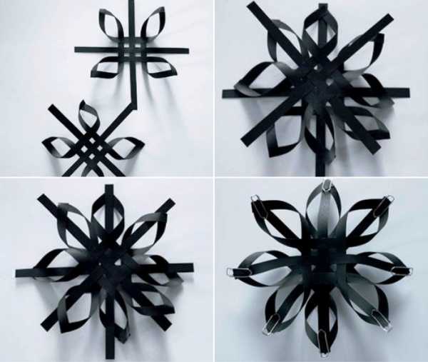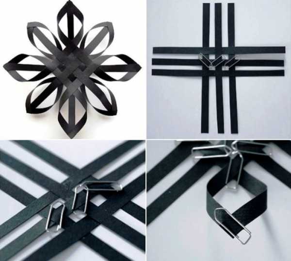 Вырежьте шесть бумажных полосок одинаковой длины и толщины. Разместите три из них под прямым углом к остальным. Средняя должна проходить над первой и третьей горизонтальными, две другие – наоборот. Зафиксируйте места пересечения скрепками. Соедините края полосок, чтобы у снежинки вышло четыре луча. По той же схеме сделайте еще одну заготовку и положите ее под прямым углом поверх первой. Получится восьмилучевая снежинка. Аккуратно закрепите её концы клеем. Украсьте готовой снежинкой дом.