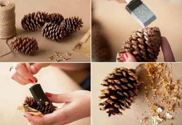 Шаг 2. Декорируем шишки. Пройдитесь по кончикам чешуек шишки щеточкой с клеем, затем оберните её золотой фольгой и потрите место, куда был нанесен клей. Тонкий слой золота покроет шишки, придав им гламурный вид и блеск. Можно поступить и проще – сбрызнуть шишки небольшим слоем золотой краски из баллончика или сделать мазки при помощи золотого акрила. Тут уж все зависит от того, какой материал есть у вас под руками.