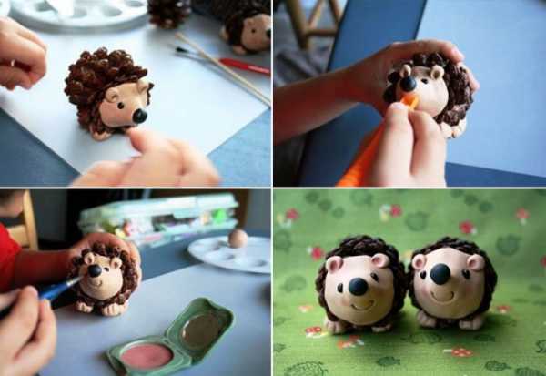 Шаг 2. Раскатайте кусок бежевого пластилина и сделайте конус. Приклейте его на верхушку шишки и слепите ежику мордочку. Скатайте два маленьких шарика, чуть приплюсните и прилепите ушки. Сделайте две колбаски – пару побольше и еще пару поменьше, чтобы приклеить к телу ежика передние и задние лапки. При помощи палочки для лепки или зубочистки нарисуйте ежику пальчики, а на мордочке – улыбку. Три шарика черного пластилина станут глазками и носиком зверька.
