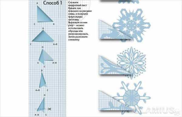 С ребятишками постарше, которые умеют обращаться с ножницами, можно вырезать красивые ажурные снежинки. Знаете ли вы, как правильно сложить лист бумаги, чтобы снежинка получилась резной и воздушной? Если нет, то смотрите схему ниже.
