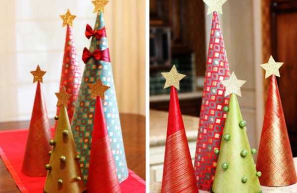 Шаг 10. Украшаем елочки по своему усмотрению: ленточками, бусинками или просто садим звездочки. Наши веселые елки готовы. К слову, вариации таких елок могут быть разные. Можно обклеить их вместо бумаги тканью. А в качестве украшений использовать бахрому, паетки, пуговки, бабочек, стрекоз и все, что попадется под руку.