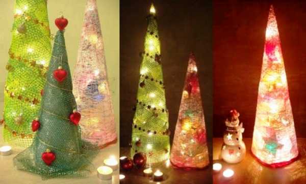 Шаг 6. Внутри нашей елочки крепим гирлянду с помощью проволочек.