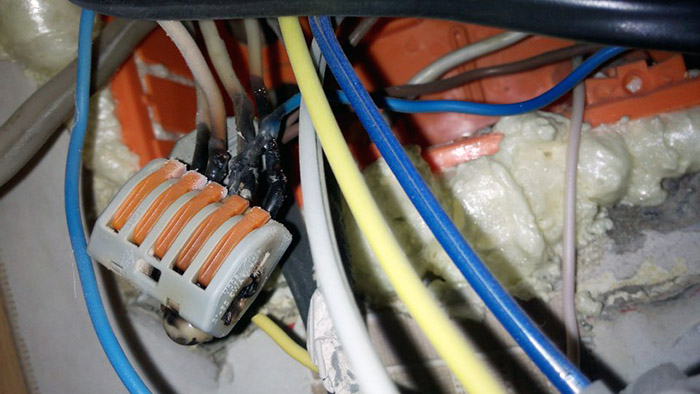 - Концы проводов внутри коробки должны иметь как минимум 200% запас по длине соединительных концов. При обрыве или отгорании, будет возможность провести повторный монтаж, не прокладывая новый провод.