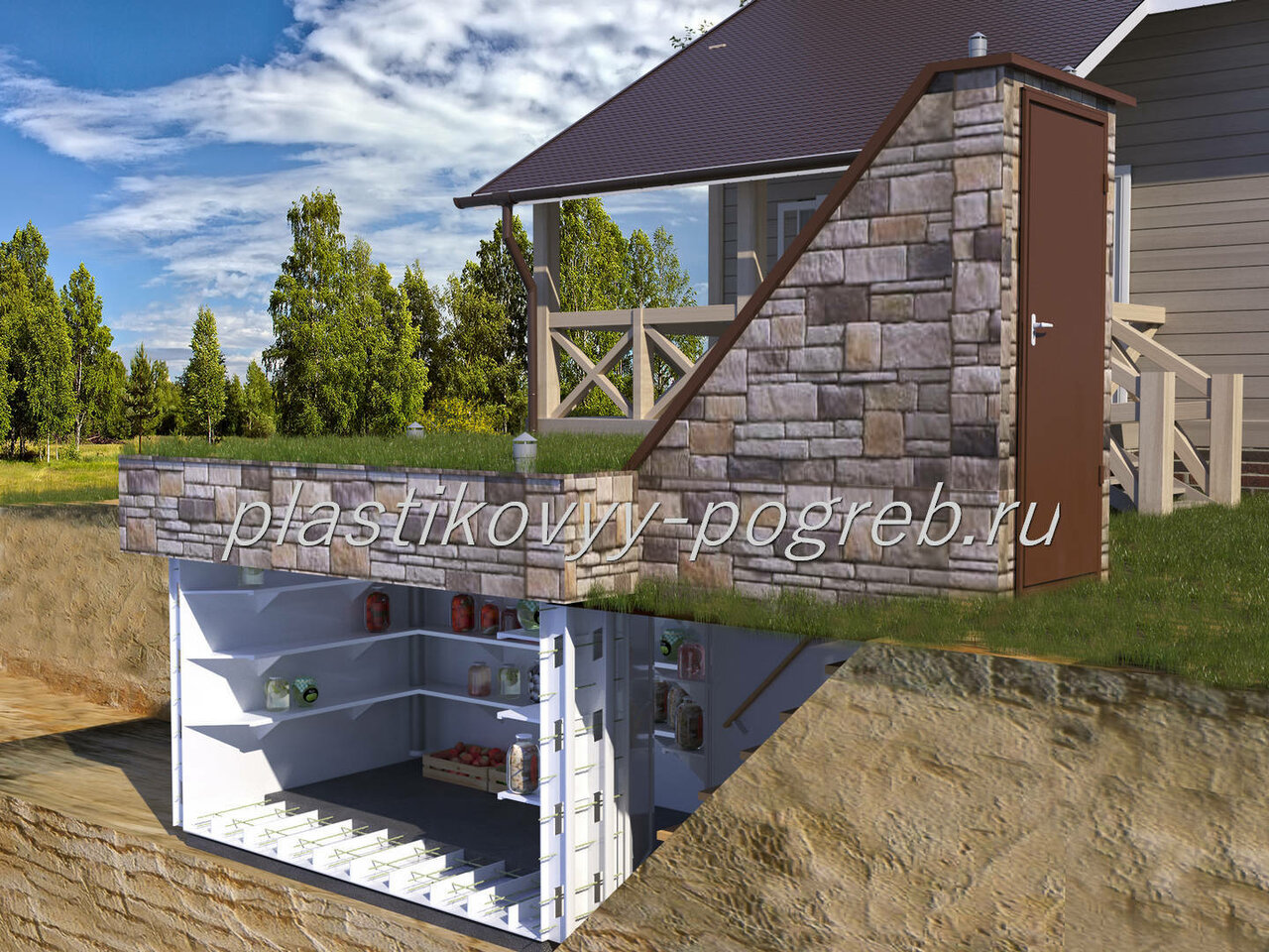Если на даче достаточно высокий уровень грунтовых вод, а потребность в погребе насущная, то можно выбрать не заглубленный в грунт погреб, а полузаглубленный или наземный.