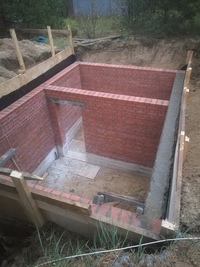 Для постройки погреба производится выемка почвы на глубину около метра. Фундамент сооружается из кирпичей или бетона, с подъемом стен на высоту до двух метров. Основой для перекрытия служит дерево, бетон или шифер.