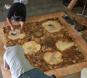 Напиленные кругляши выкладываются по всей площади полов. Раскладку лучше начинать с самых крупных срезов, оставляя между ними пространство для более мелких элементов.