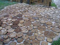 - На завершающем этапе, когда все срезы будут уложены, выполняется заделка швов, а заодно и скрепление фрагментов пола. Используют для этого своеобразную самобытную пасту, в которой смешана влажная глина, известь и опилки, образовавшиеся в процессе распиловки бревен. Эту пасту нужно в буквальном смысле слова прессовать в пустое пространство между срезами – так, чтобы она зашла по всей их высоте.
