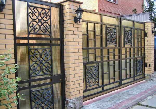 Благодаря широкой гамме оттенков и цветов есть возможность сочетать поликарбонат с другими строительными материалами: металлом, бетоном, деревом, камнем и прочим. Это позволит экспериментировать и удачно вписать забор как в городской ландшафт, так и в деревенский. Особенно красиво смотрятся непрозрачные ограды, сочетающие в себе сотовый поликарбонат и кованые детали, как видно на фото.