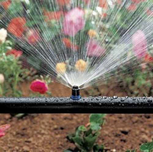 Такая система полива относится к разновидности дождевальной. Для нее необходим еще более мощный двигатель, так как вода, доставляемая по трубам, проталкивается сквозь форсунки незначительного диаметра, оборудованные распылителями. Давление в трубопроводе при этом может составлять от30 до 50 бар.