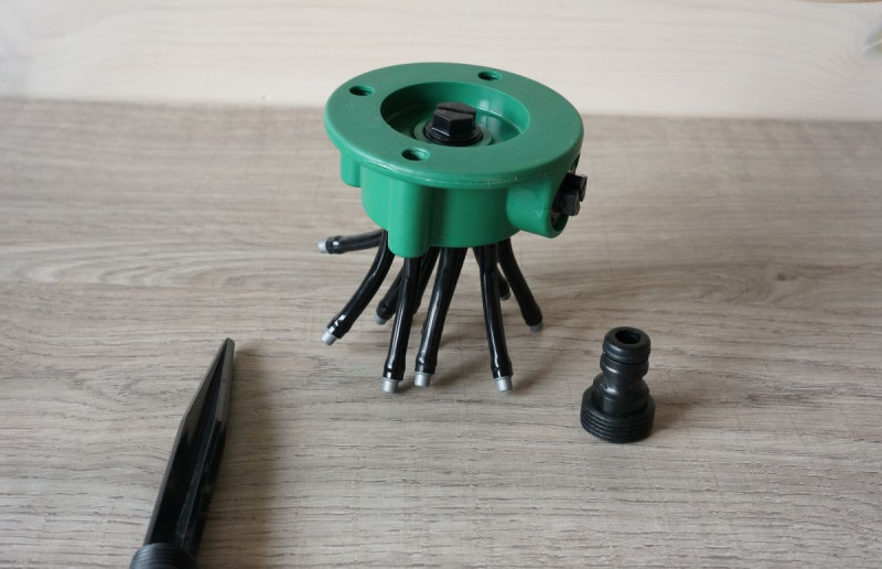 Двенадцать гибких трубочек изгибаются под произвольным углом и фиксируются в заданном положении, удобно для полива цветов или в теплице, направив полив именно в нужном направлении. Под напором воды не разгибаются.