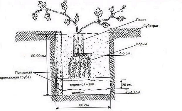 - Выкапывают лунки глубиной 80 см и диаметром 60 см. На дно насыпают слой дренажа толщиной не менее 5 см. В лунку втыкают трубу, через которую будет осуществляться полив.