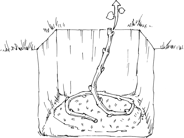 К моменту посадки раствор впитается и подсохнет. - В яму устанавливают чубуки верхней стороной вниз и засыпают землей так, чтобы сверху образовался слой толщиной 5 см.