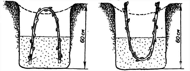 - С осени или весной (после схода снега) выкапывают яму глубиной 50-60 см. Она должна быть немого глубже, чем длина черенков. Важно это сделать заранее, чтобы почва успела прогреться к посадке.