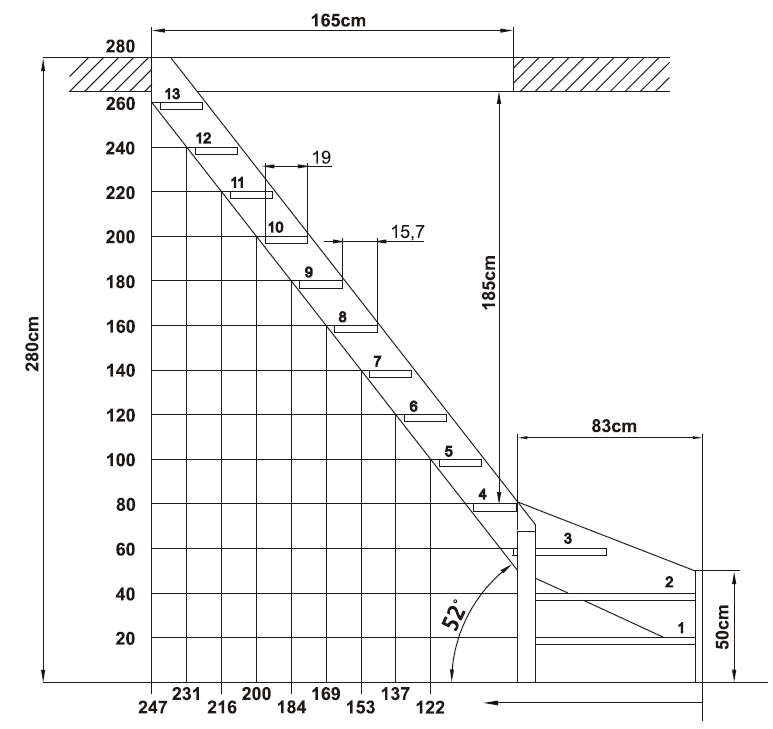 Размер проступи аподбирается в зависимости от высотыhпо графику или вычисляется из зависимостиa+h=450мм. В обоих случаях,а=295,5мм.