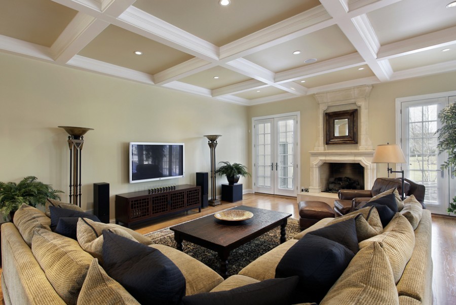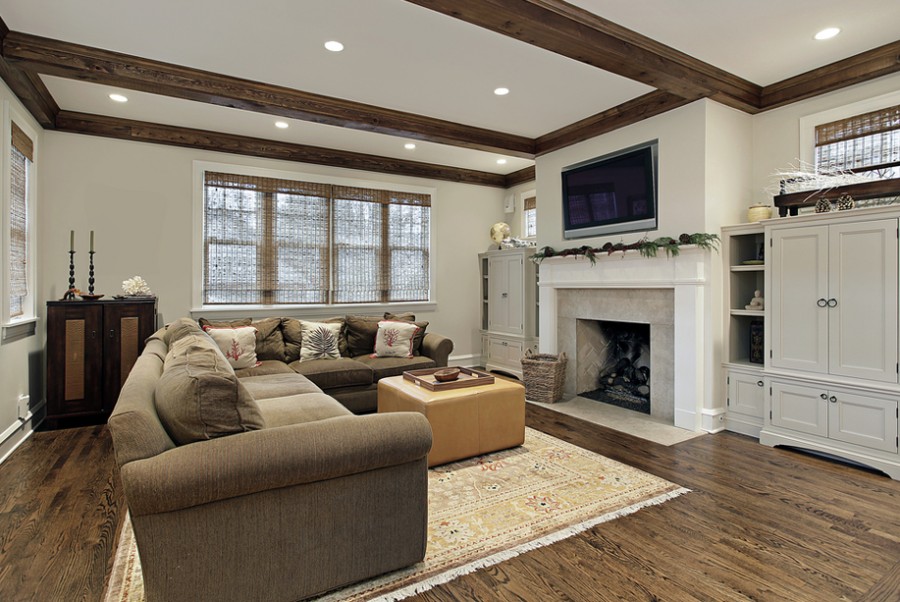 Для маленьких гостиных лучше подыскивать балки чистого белого цвета, которые не допустят эффекта давящего потолка и визуально увеличат пространство.
