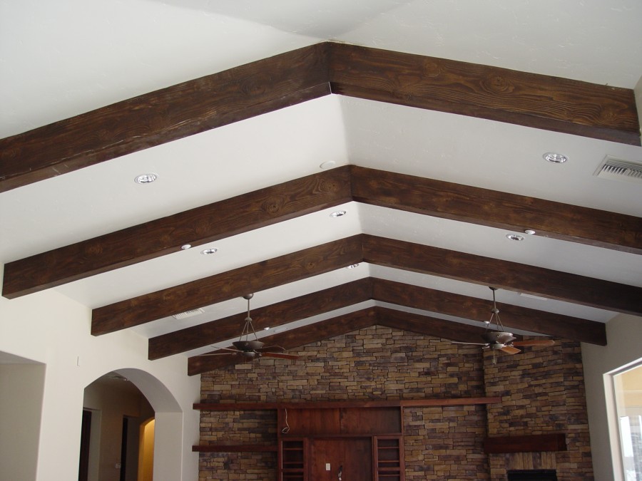 Если же нет возможности открыть конструкцию из декоративных балок, а хочется это сделать, тогда используют современные фальшбалки. Они достаточно легки, имеют большую цветовую гамму.