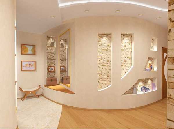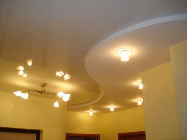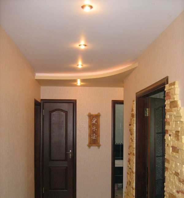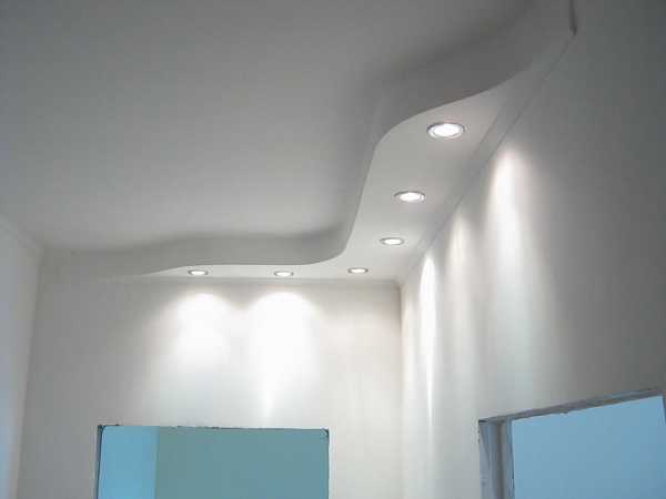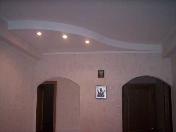 Конструкции с плавными изгибами или ступенчатые варианты в виде лесенки придадут коридору легкости и дополнительного пространства, и при этом не будут создавать излишнюю нагрузку на потолочной плоскости.