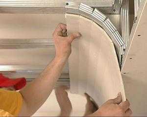 У этого метода есть недостаток: если внутренняя сторона мало промокнет, вместо гладкой поверхности вы получите заломы на листе, которые очень трудно будет заштукатурить. Если вы смонтировали каркас на потолке, лист лучше гнуть на другой поверхности по трафарету.