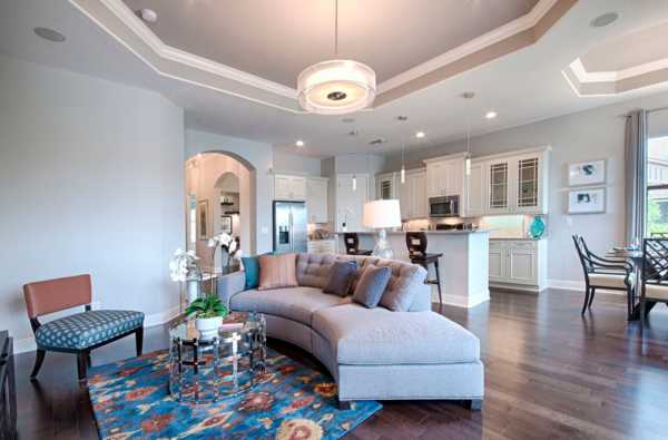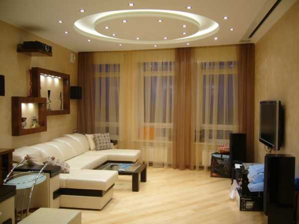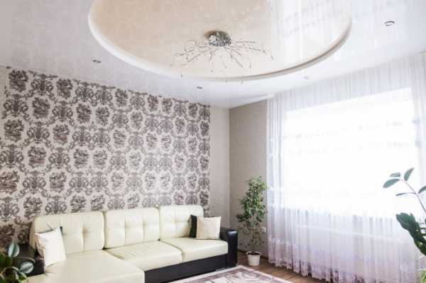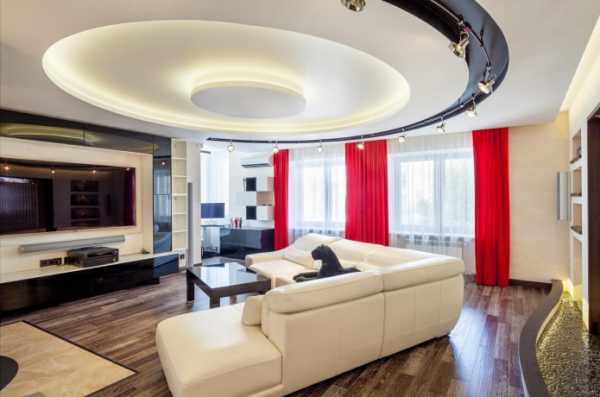 Если грамотно учитывать особенности гостиной, то можно создать уникальный дизайн, который будет являться самым главным элементом всей комнаты. Криволинейные натяжные или подвесные модели зададут залу конкретный стиль и сделают интерьер гармоничным, оригинальным и интересным.