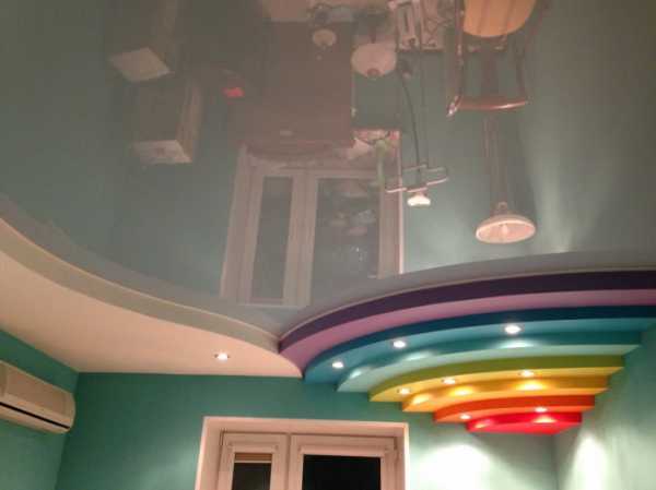 - Глянцевая. Прекрасно отзеркаливает свет и создает интересные блики. Глянцевые натяжные полотна делают комнату визуально больше и глубже.