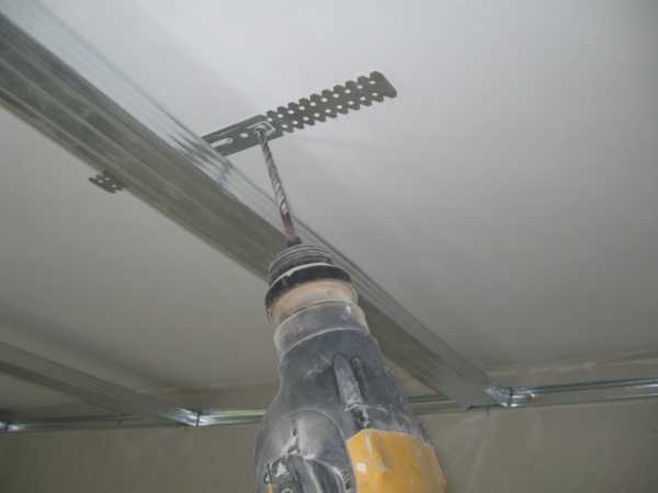 Возьмите профиль и нарежьте его на участки, равные друг другу по размерам. Прикрепите к потолку и прикрутите гипсокартон.