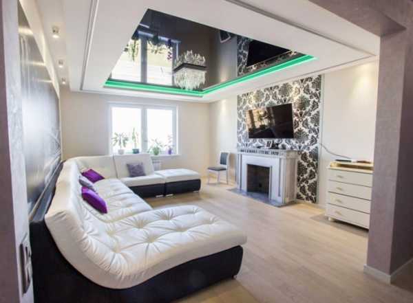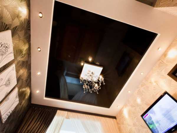 На фото черно-белый фигурный натяжной потолок в интерьере.