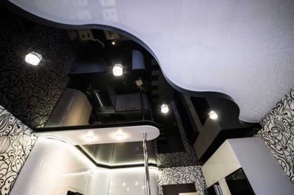 На фото глянцевый фигурный натяжной потолок в черно-белых цветах.