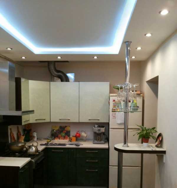 На фото белый фигурный потолок в форме круга в интерьере кухни.