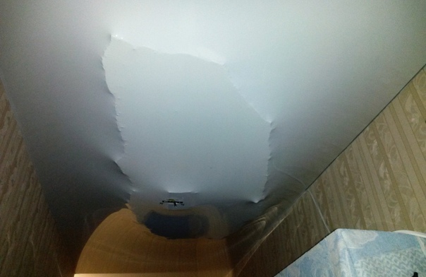 - можно проткнуть натяжной потолок если затопили соседи. В таком случаи отремонтировать натяжной потолок после того, как сделали прокол невозможно. Категорически запрещается проткнуть натяжной потолок с водой любыми острыми предметами. В таких случаях нужно вызывать компанию, которая устанавливала данный потолок, чтобы они сливали воду.