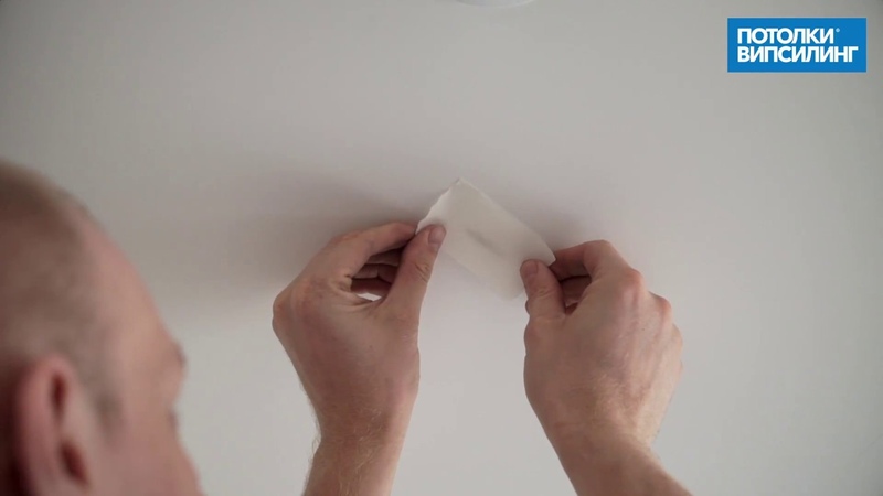 - Перед любым наклеиванием заплаток необходимо обезжиривать место, подвергаемое ремонту. Не используйте спирт или растворители, они могут повредить потолок. Лучше всего применить специальные средства для ухода за натяжными потолками или раствор хозяйственного мыла.