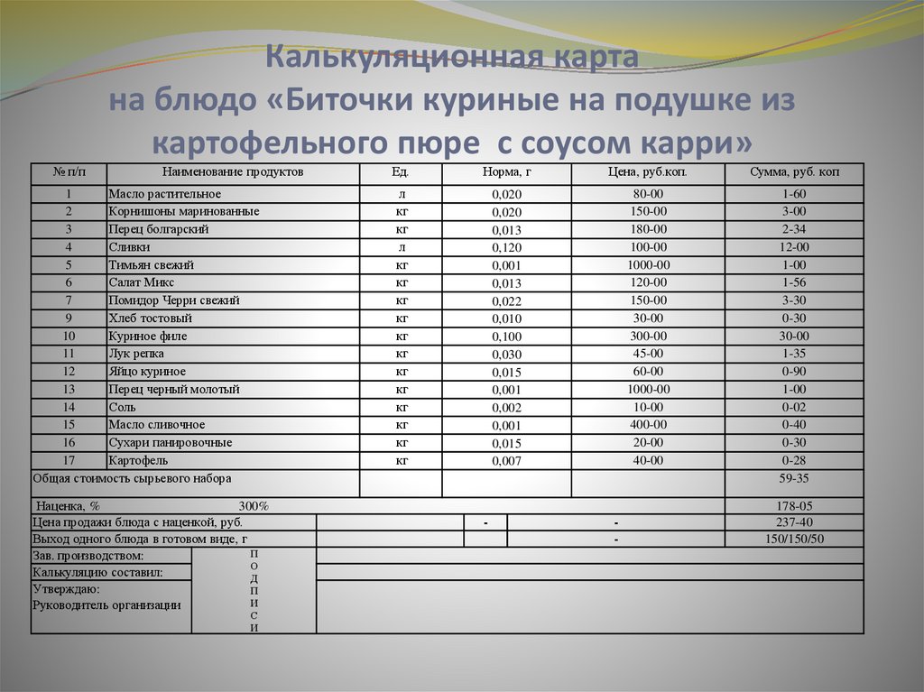Важно контролировать затраты на ингредиенты, чтобы блюдо в меню оставалось прибыльным.