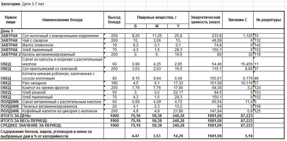 Пример расчета калорийности и корректировки меню
