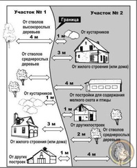 По санитарно-бытовым нормам постройки необходимо расположить на правильном расстоянии от находящихся на соседних участках: от жилого строения или дома до бани, душа или уборной – 8 м; от колодца до уборной и компостного устройства – 8 м. От дома до уборной не менее 12 метров. Граница соседнего участка должна находиться в 3 м от жилого строения (или дома), в 4 м – от построек для содержания мелкого скота или птицы, в 1 м – от других построек, в 4 м – от стволов низкорослых деревьев (в 2 м – от среднерослых), в 1 м – от кустарника.
